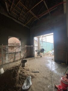 Mái ngói màu xám kết hợp với những chi tiết kiến trúc hiện đại như cầu thang đá và các đường nét sắc sảo tạo nên một tổng thể hài hòa.
