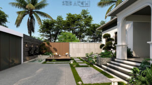 Khi bước vào sân vườn của mẫu biệt thự này, bạn sẽ ngay lập tức cảm nhận được sự hòa quyện giữa thiên nhiên và không gian sống hiện đại. Mỗi bước chân trên thảm cỏ xanh mướt mang đến một cảm giác nhẹ nhàng, thư thái như được bước vào một khu vườn thiên nhiên thực sự. Tiếng nước nhẹ nhàng từ vòi phun trong hồ cá như một bản nhạc du dương, xua tan mọi căng thẳng trong tâm trí.
