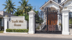 Hệ thống tường rào và cổng sắt nghệ thuật bao quanh Biệt thự Tuyết Mai House cũng là một điểm cộng lớn. Những hoa văn uốn lượn tinh xảo trên cổng sắt đen không chỉ có tác dụng bảo vệ mà còn tăng thêm vẻ quý phái cho mặt tiền. Tấm biển tên “Tuyết Mai House” được đặt trang trọng ngay cổng chính, khẳng định cá tính và niềm tự hào của chủ nhân đối với tổ ấm của mình.