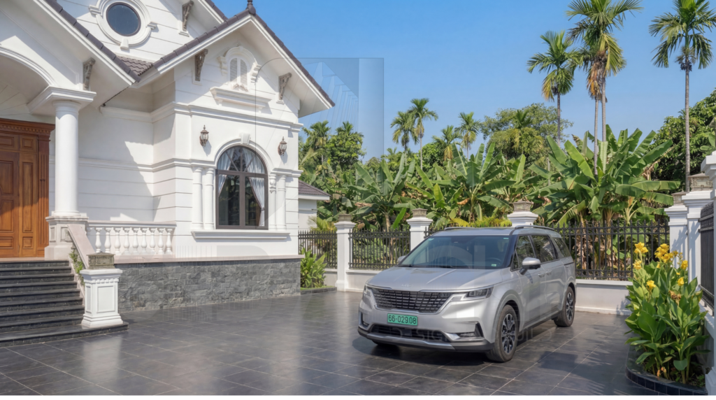 Không chỉ chú trọng vào ngôi nhà chính, phần không gian ngoại thất của Biệt thự Tuyết Mai House cũng được đầu tư bài bản với diện tích sân vườn rộng rãi. Toàn bộ phần sân được lát gạch tối màu sạch sẽ, tạo không gian đủ lớn để đậu xe hơi (như chiếc Kia Carnival hiện đại trong ảnh) và tổ chức các buổi tiệc ngoài trời.