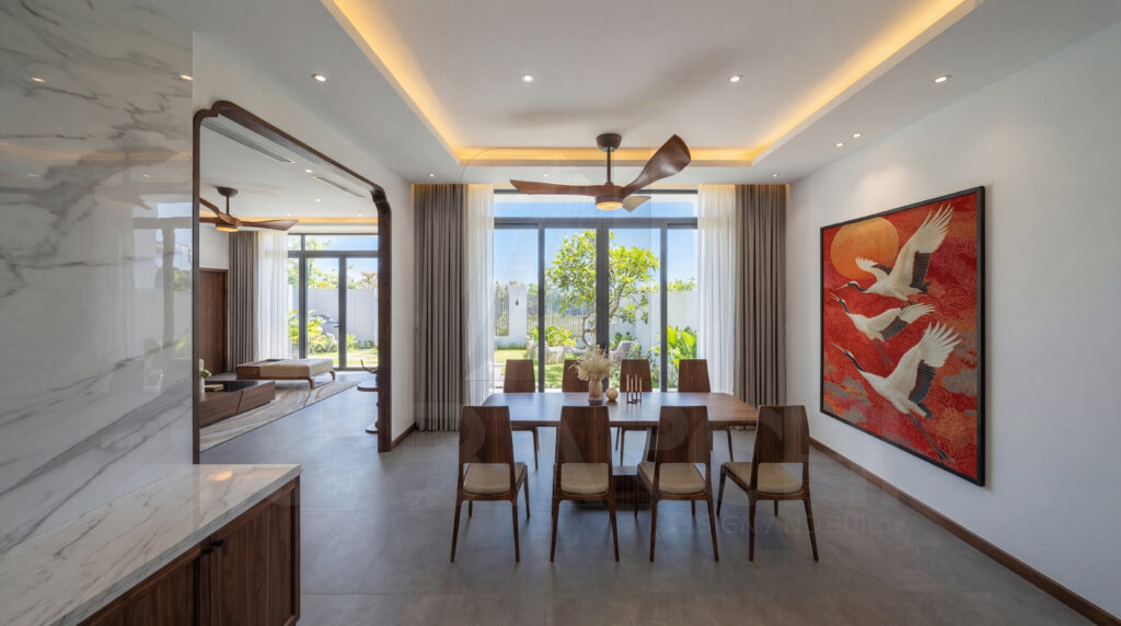 Không chỉ chú trọng đến yếu tố thẩm mỹ, thiết kế còn đảm bảo công năng sử dụng cho từng khu vực sinh hoạt. Từ phòng khách, phòng thờ đến khu bếp – phòng ăn, tất cả đều được thiết kế đồng bộ, tạo nên một tổng thể thống nhất và tinh tế.