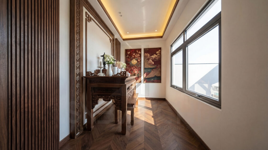 Sự kết hợp giữa nội thất gỗ, ánh sáng và bố cục đối xứng giúp phòng thờ trở thành một không gian trang trọng nhưng vẫn hài hòa với tổng thể thiết kế nội thất hiện đại.