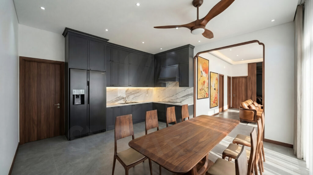 Khu vực bếp và phòng ăn được thiết kế theo hướng hiện đại và tối ưu công năng, đáp ứng nhu cầu sinh hoạt hằng ngày của gia đình.