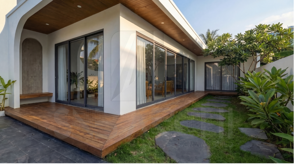 Bên cạnh đó, hệ cửa kính còn giúp kết nối trực tiếp giữa không gian nội thất và khu sân vườn bên ngoài. Chỉ cần mở cửa là gia chủ có thể bước ra khu hiên gỗ hoặc khu vườn nhỏ bên cạnh nhà để thư giãn, uống trà hoặc đọc sách.