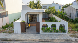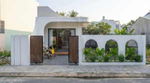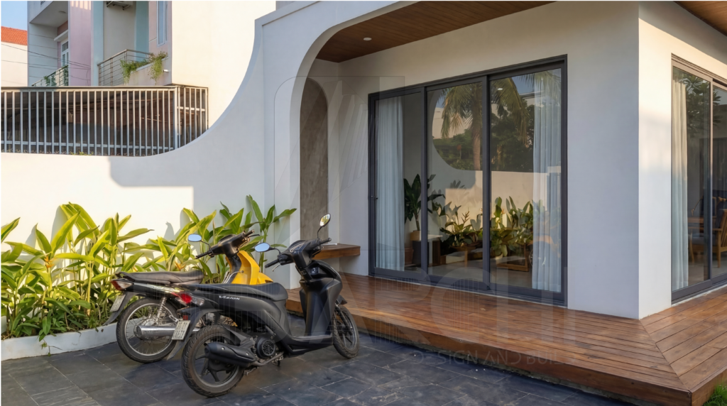 Ngoài ra, phần hiên nhà được thiết kế rộng rãi với sàn gỗ ngoài trời, vừa đóng vai trò là không gian thư giãn, vừa giúp tăng tính thẩm mỹ cho mặt tiền. Kiến trúc này mang lại cảm giác nhẹ nhàng, thanh thoát và phù hợp với những gia chủ yêu thích phong cách sống hiện đại.