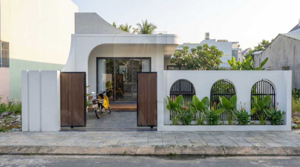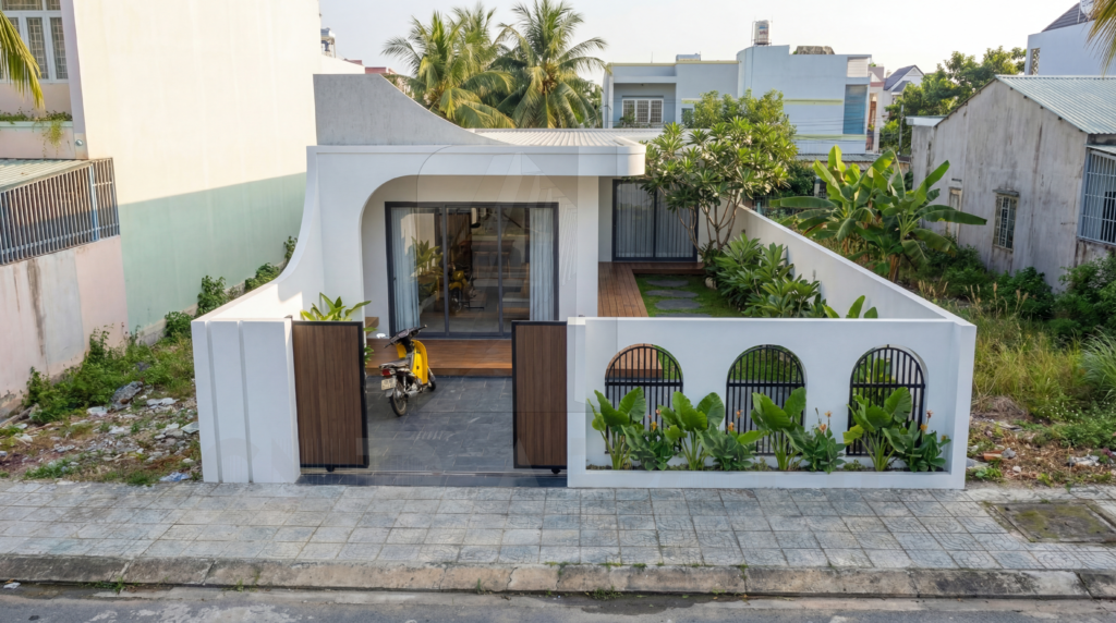 Một điểm đáng chú ý khác trong thiết kế của mẫu nhà cấp 4 này là các góc bo cong ở phần mái và tường hiên. Chi tiết này không chỉ giúp công trình trở nên mềm mại hơn mà còn tạo dấu ấn riêng, tránh sự đơn điệu thường thấy ở nhiều mẫu nhà một tầng.