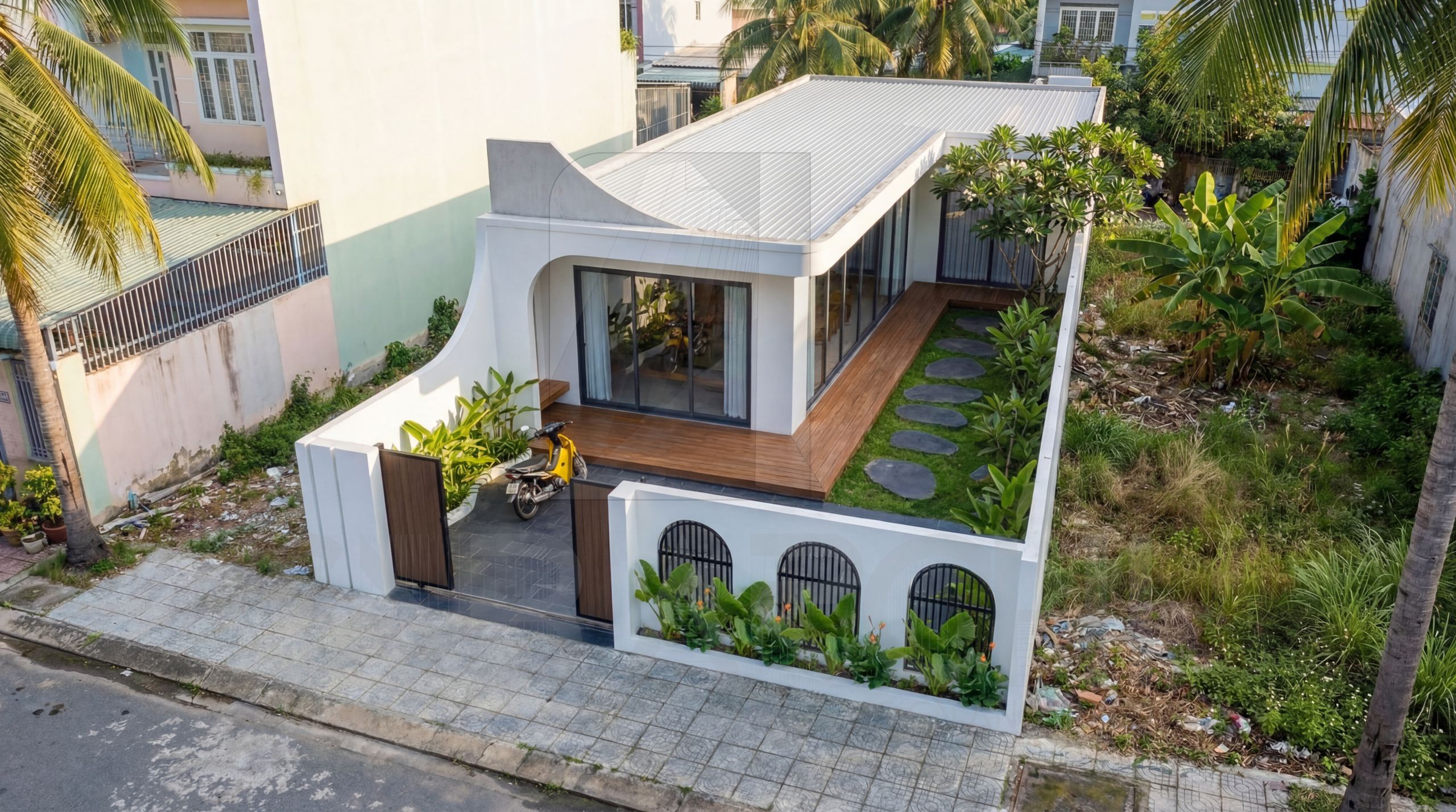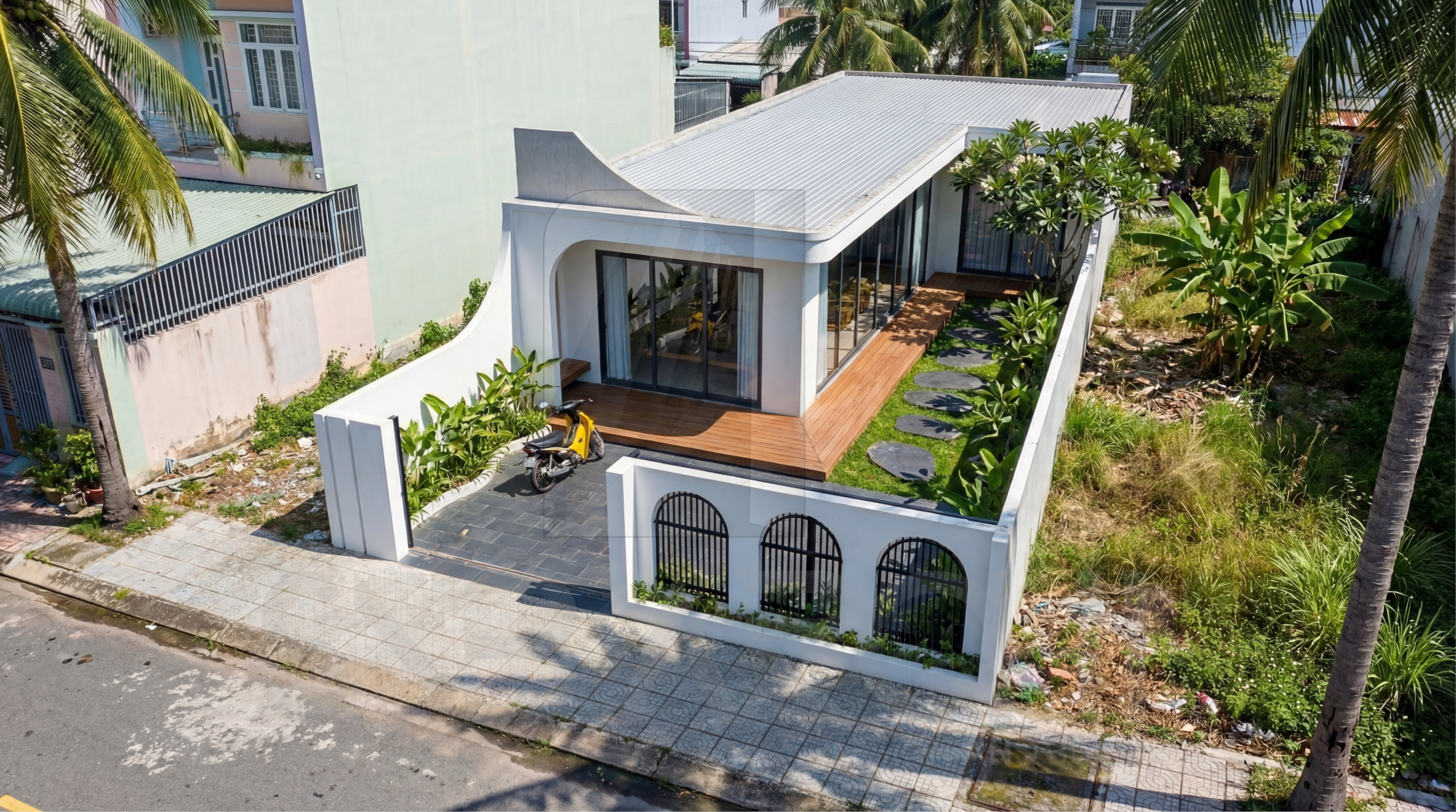 Điểm nổi bật đầu tiên của mẫu nhà cấp 4 hiện đại này chính là hình khối kiến trúc mềm mại và tinh tế. Phần mái được thiết kế với đường cong nhẹ, tạo nên nét khác biệt so với các kiểu mái truyền thống. Sự kết hợp giữa tường sơn trắng, trần ốp gỗ và hệ cửa kính khung nhôm tối màu giúp tổng thể ngôi nhà trở nên sang trọng nhưng vẫn giữ được sự tối giản cần thiết.