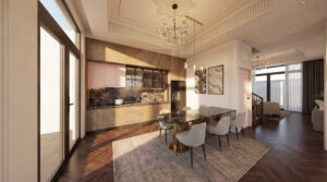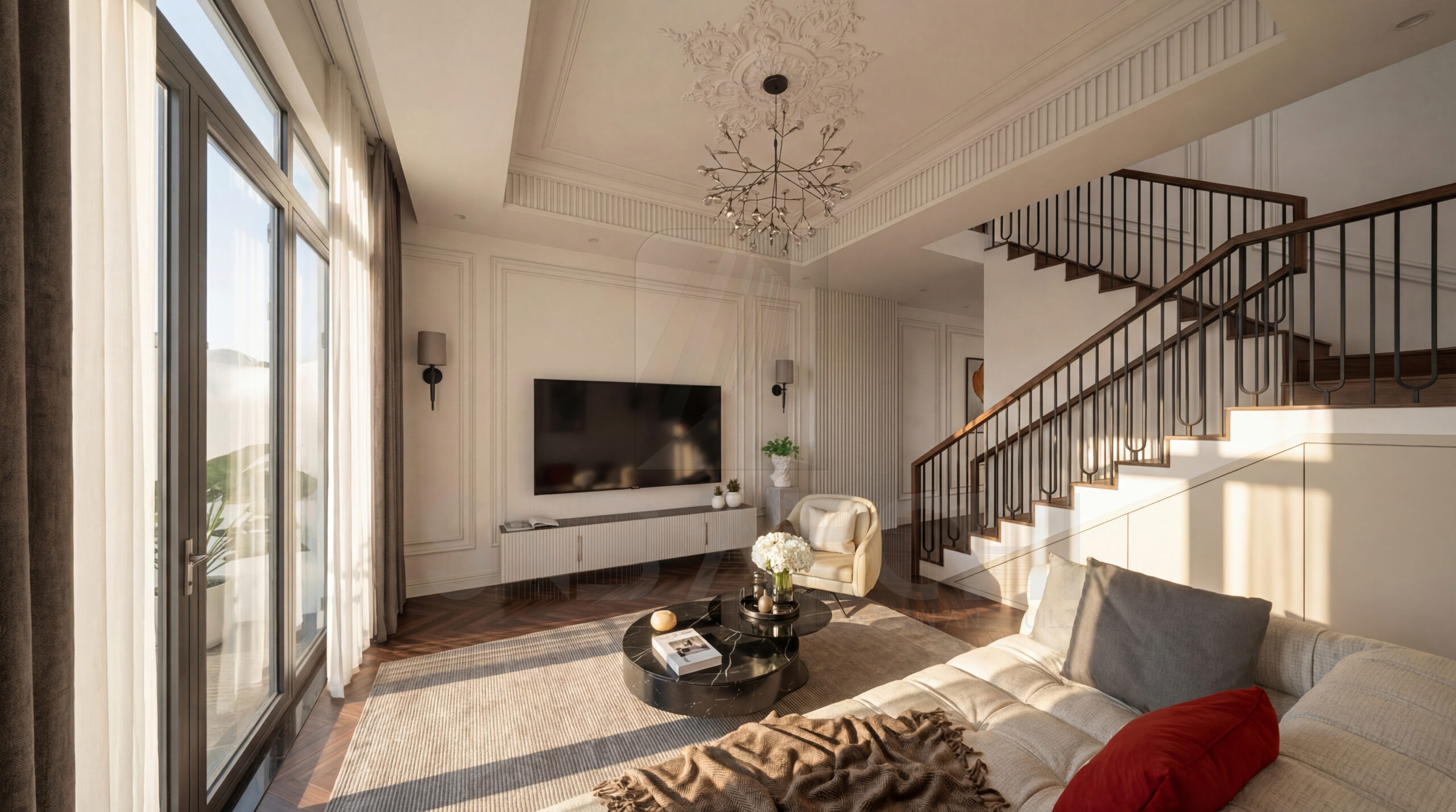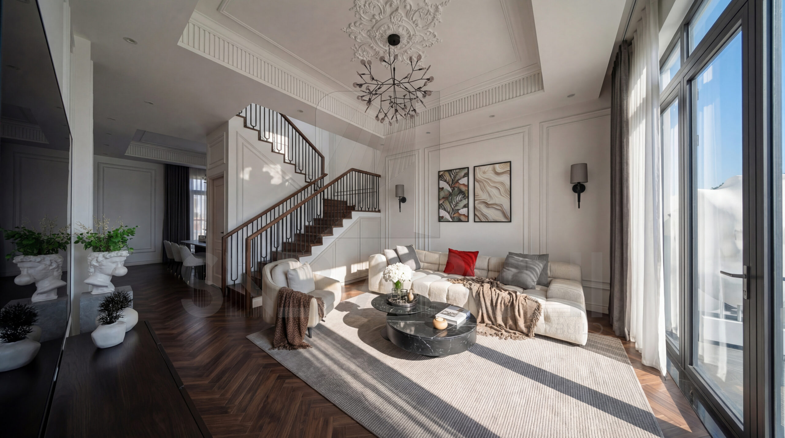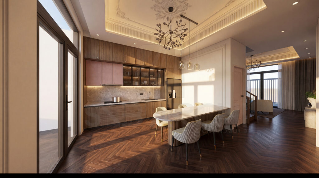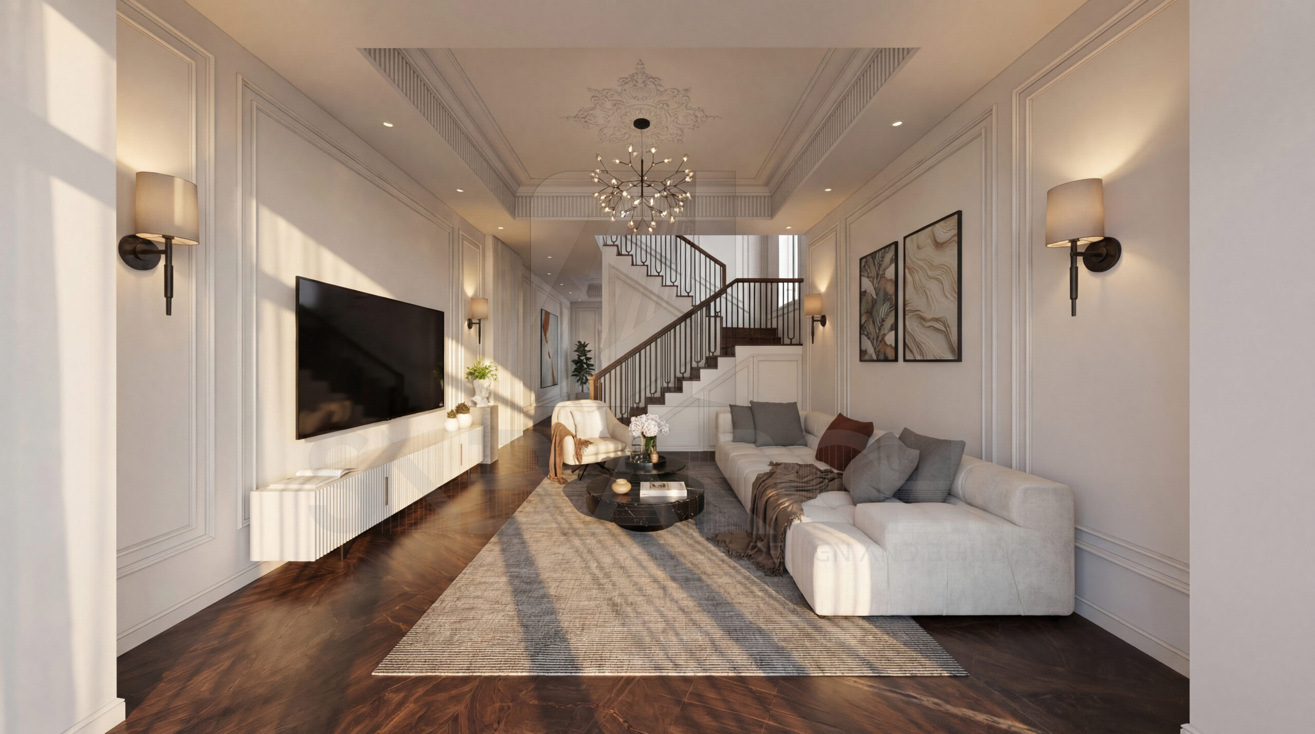 Công trình nội thất tân cổ điển hiện đại dưới đây được SNB ARCHI thiết kế là một ví dụ tiêu biểu cho phong cách Modern Classic, khi từng chi tiết từ phòng khách, cầu thang cho đến khu bếp – bàn ăn đều được thiết kế hài hòa, mang lại tổng thể không gian sống sang trọng nhưng vẫn gần gũi và ấm cúng.