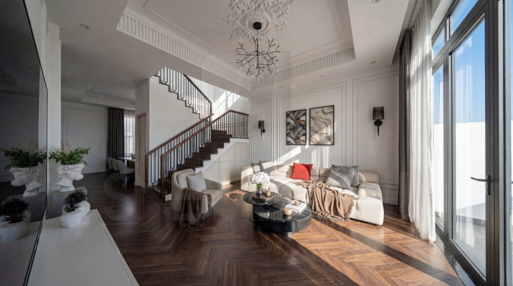 Sàn nhà được lát gỗ xương cá cao cấp – một lựa chọn phổ biến trong các công trình nội thất tân cổ điển, không chỉ mang lại cảm giác ấm áp mà còn góp phần tăng thêm vẻ sang trọng cho toàn bộ không gian nội thất.