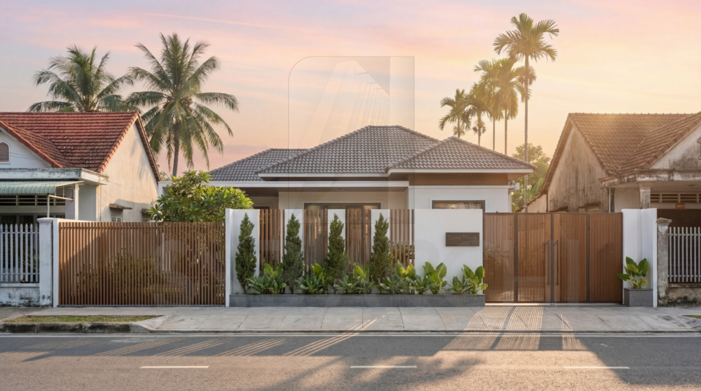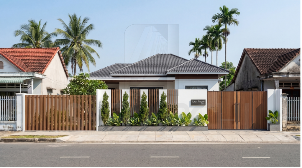 Cổng chính cũng sử dụng thiết kế nan dọc đồng nhất với hàng rào, mang tông màu nâu gỗ ấm áp. Đặc biệt, dọc theo chân tường rào của căn nhà mái nhật sân vườn là bồn hoa nhỏ trồng các loại cây dáng cao như tùng tháp, xen kẽ cây bụi thấp, vừa có tác dụng cản bụi, vừa tạo điểm nhấn xanh mát ngay từ cái nhìn đầu tiên.