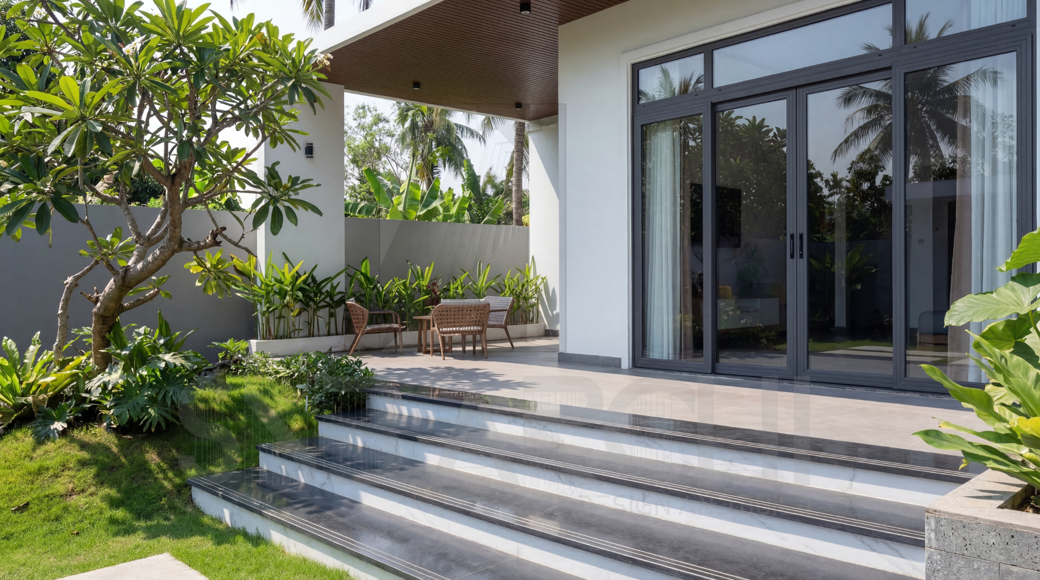Giải pháp này không chỉ giúp ngôi nhà luôn bừng sáng nhờ đón trọn ánh sáng tự nhiên mà còn tạo tầm nhìn view cực “chill” ra khoảng không phía trước. Phần hiên rộng rãi của mẫunhà mái nhật sân vườn được lát gạch thẻ giả gỗ ấm áp, kết hợp với các bậc tam cấp ốp đá tự nhiên màu đen vân trắng, càng làm tăng thêm sự vững chãi, hiện đại và lôi cuốn cho khu vực sảnh chính.