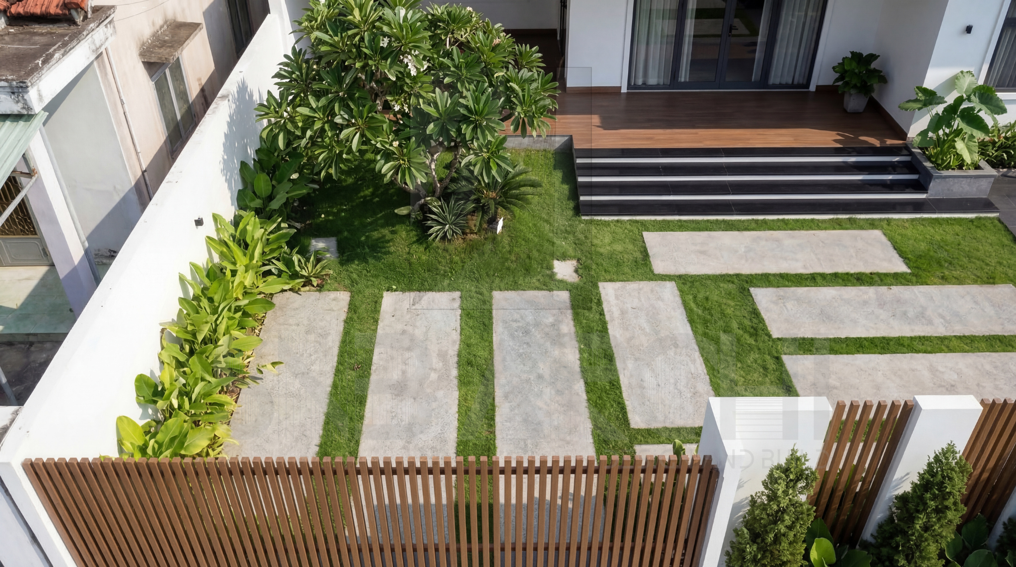 Thảm cỏ xanh mướt được tô điểm bởi những khối bê tông chữ nhật lát xen kẽ, tạo nên lối đi dạo đầy chất thơ và nghệ thuật. Xung quanh góc sân và trước hiên của căn nhà mái nhật sân vườn là sự hiện diện của các loại cây cảnh nhiệt đới như hoa đại (hoa sứ), các dòng cây lá khoai, trầu bà. Sự kết hợp hài hòa này giúp ngôi nhà luôn ngập tràn sinh khí.