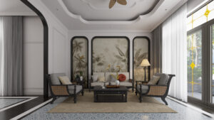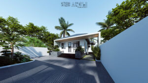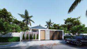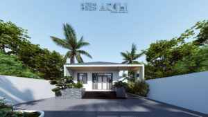1.2 Công năng hợp lý: Các chi tiết như bậc tam cấp làm từ đá tự nhiên, kết hợp với bức tường bảo vệ cao tạo ra không gian riêng tư nhưng vẫn duy trì sự thông thoáng mẫu villa 1 tằng mái nhật. Thiết kế này không chỉ mang lại tính thẩm mỹ mà còn đảm bảo sự an toàn và riêng tư cho các thành viên trong gia đình.