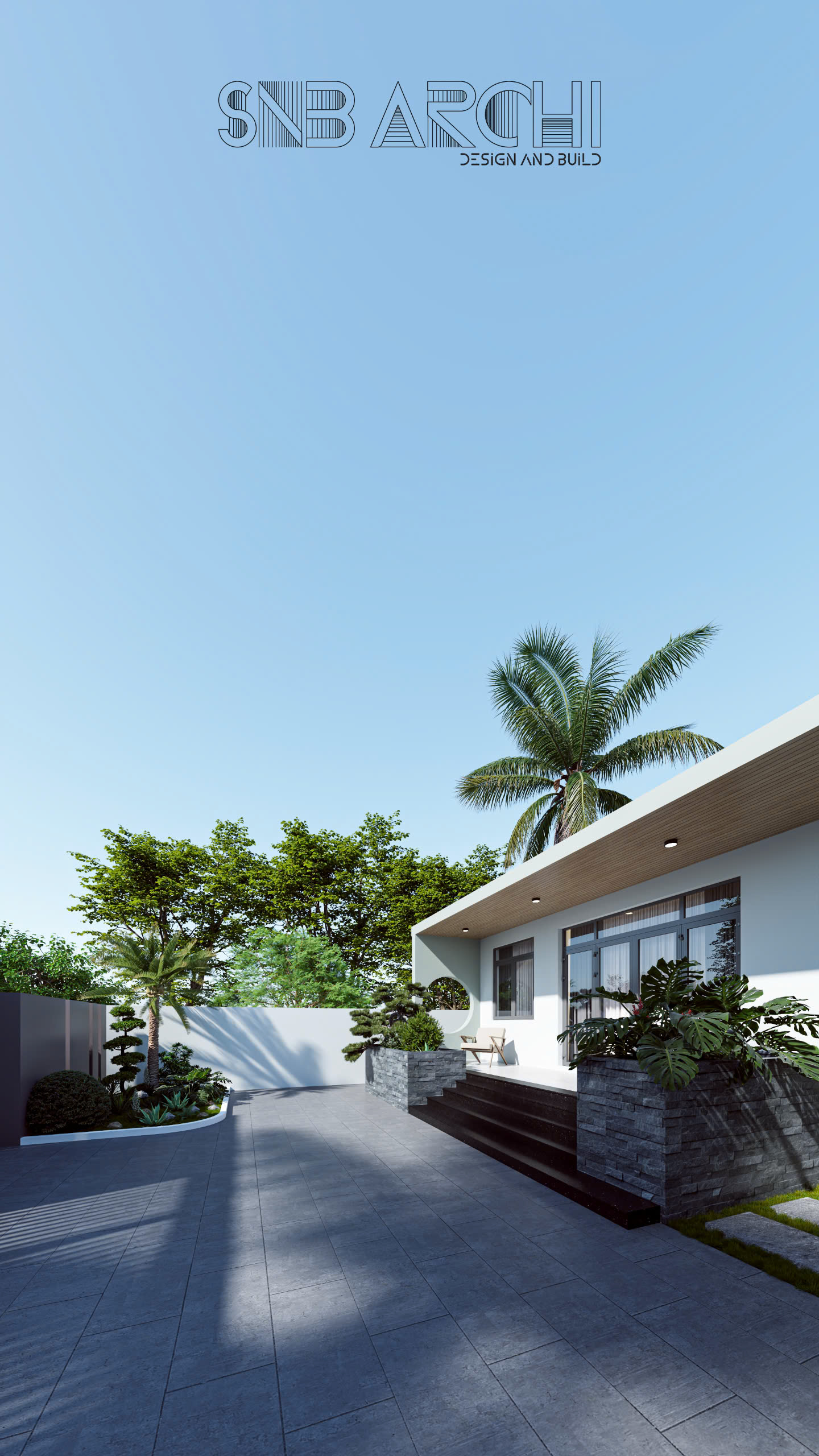 Một trong những điểm nổi bất khiến cho tổng thể sân vườn trở nên thu hút là sự tinh tế bố trí cây côi trong khoảnh sân. Sự xuất hiện của các loại cây xanh như cây cọ, dừa, và các loại cây bụi thấp, những cây này có  tán lá để tạo bóng mát mà còn góp phần tạo cảm giác liên kết  gần gũi với thiên nhiên.  Các tiểu cảnh được bố trí dọc theo lối đi, tạo thành một hành lang xanh mát, giúp làm mềm mại không gian sân vườn.