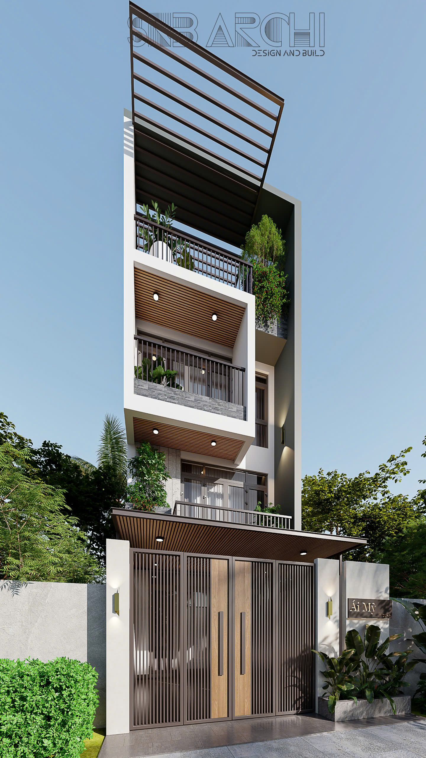 Hệ cổng sắt kết hợp cửa gỗ không chỉ mang lại độ bền cao, chống chịu thời tiết tốt mà còn tạo điểm nhấn tương phản giữa chất liệu kim loại lạnh và vẻ ấm áp của gỗ tự nhiên. Lan can ban công với thiết kế thanh mảnh bằng kim loại không chỉ đảm bảo an toàn mà còn góp phần làm nhẹ nhàng và tinh tế cho tổng thể kiến trúc, tránh cảm giác nặng nề, thô cứng.