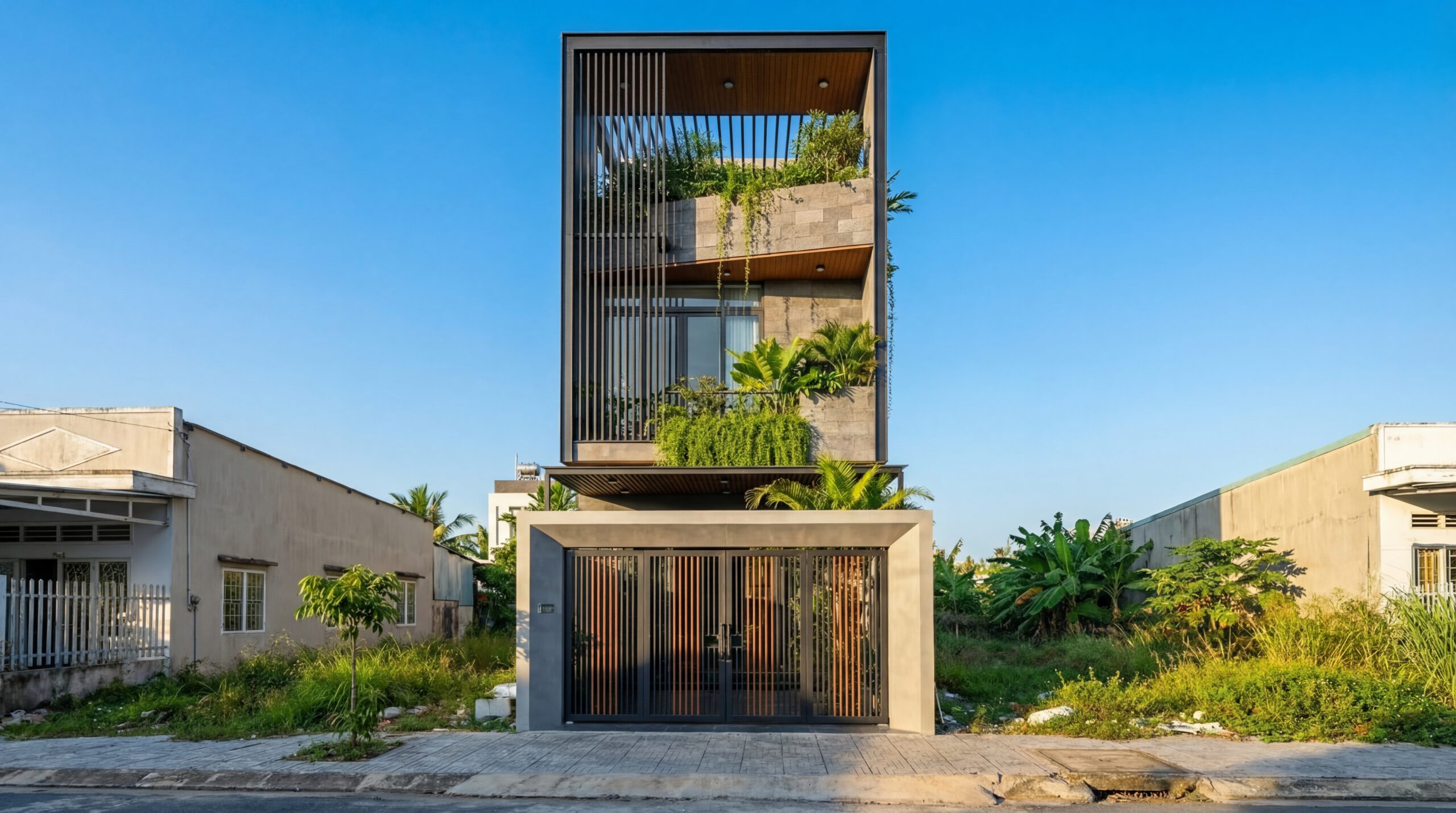 Hệ thống cửa cổng cũng được thiết kế đồng nhất với hệ lam mặt tiền, tạo nên một ngôn ngữ kiến trúc xuyên suốt từ lối vào cho đến tầng cao nhất. Sự kết hợp giữa khung bê tông vững chãi và các thanh nan dọc đơn giản nhưng chắc chắn không chỉ đảm bảo an ninh mà còn tạo ra một sự chào đón sang trọng ngay từ cái nhìn đầu tiên. Từng chi tiết nhỏ nhất đều được tính toán kỹ lưỡng, khẳng định vị thế độc bản và gu thẩm mỹ không hòa lẫn của chủ nhân ngôi nhà.