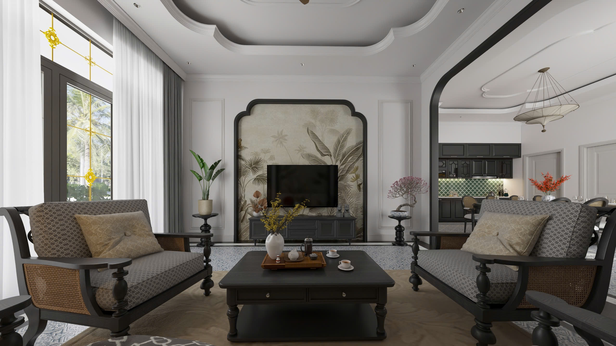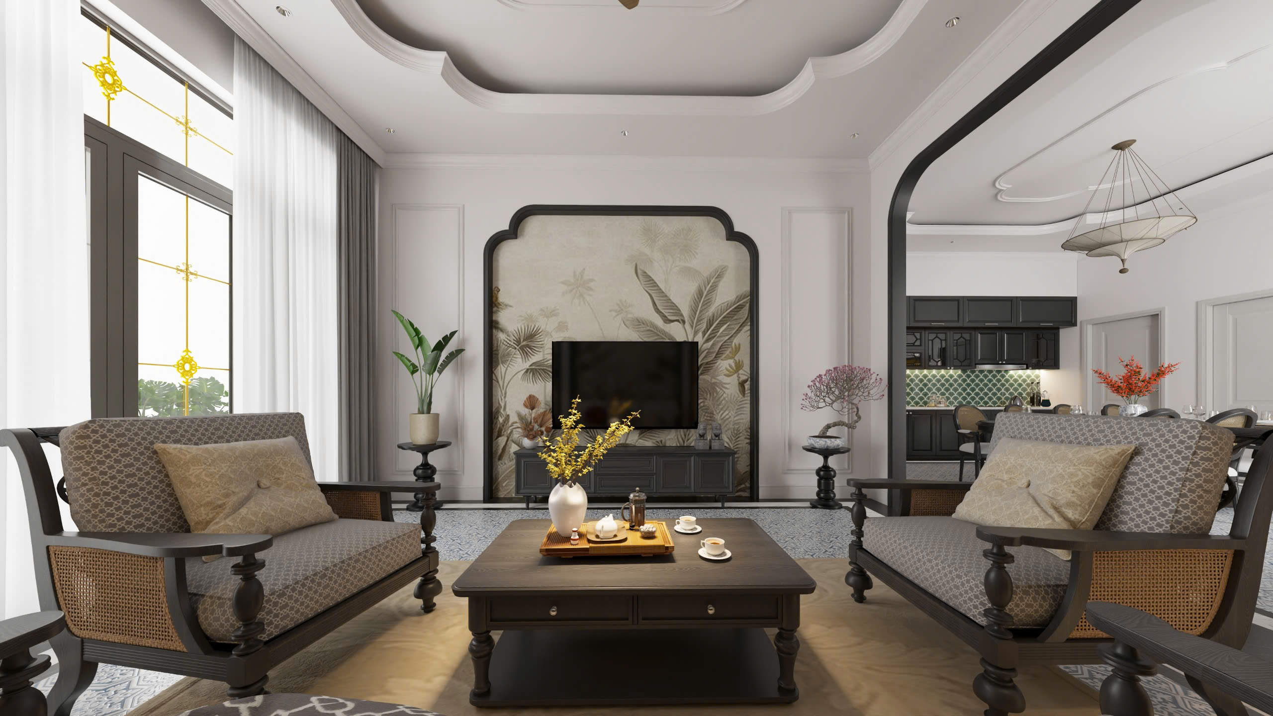Tông màu chủ đạo trắng – be – đen gỗ được phối hợp hài hòa, tạo nên cảm giác sang trọng nhưng không lạnh lẽo. Ánh sáng tự nhiên len qua lớp rèm mỏng, phản chiếu lên bề mặt gỗ và gạch bông, khiến không gian vừa ấm áp vừa đầy sức sống.