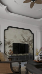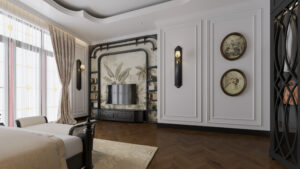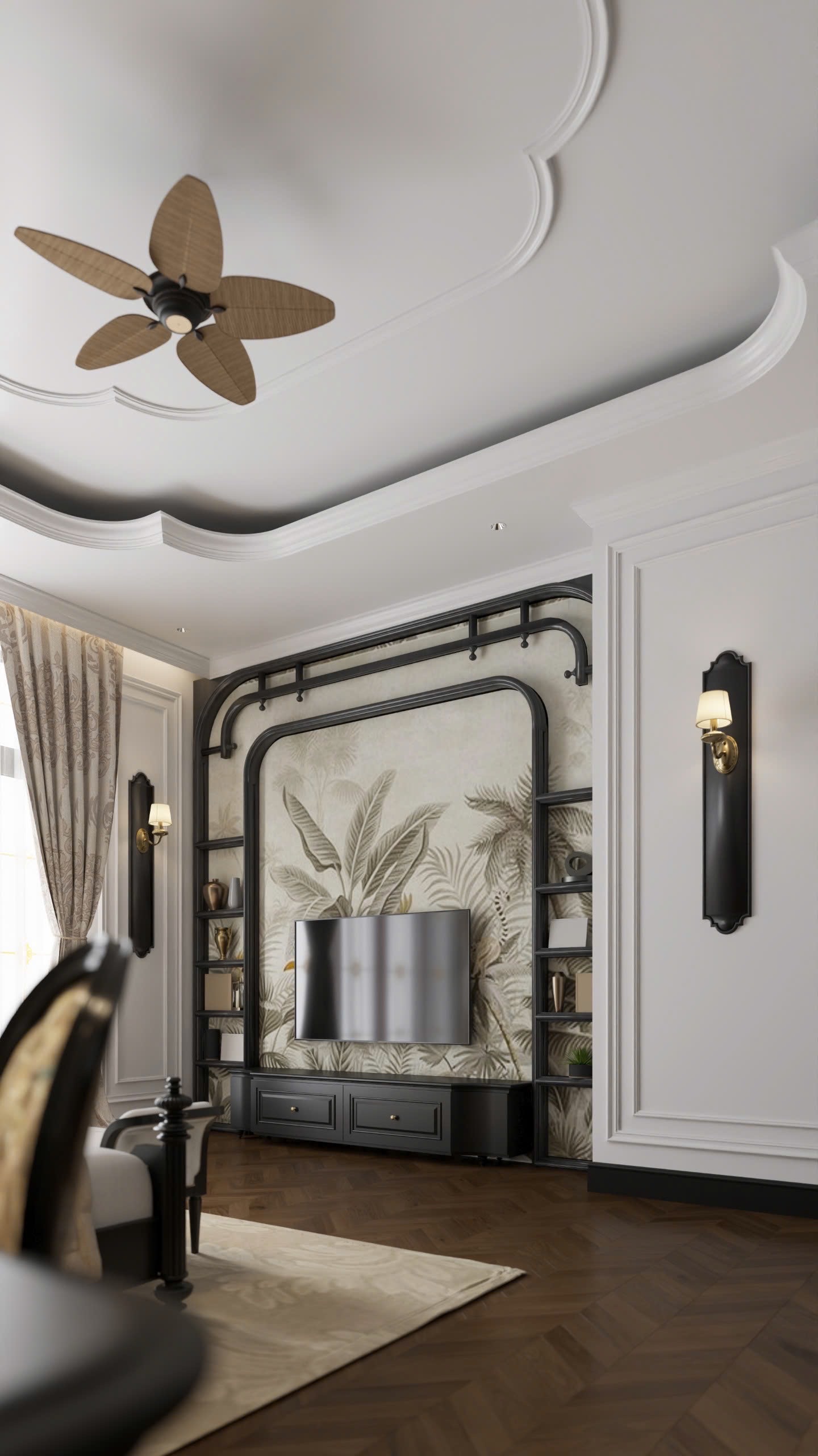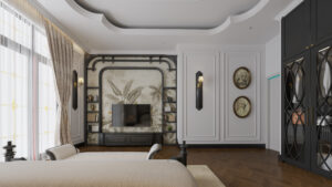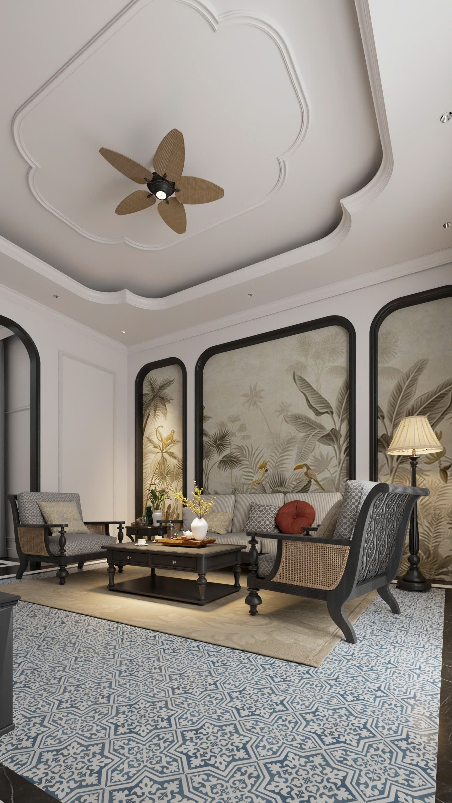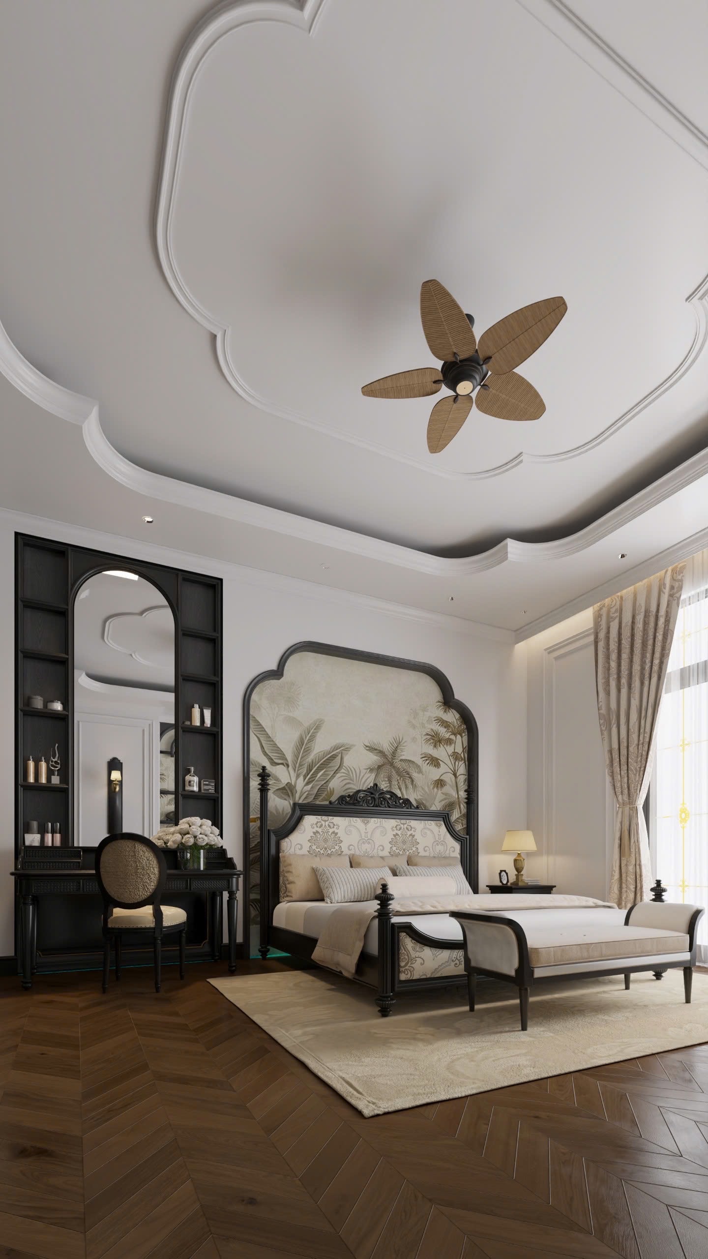 Trần phòng được thiết kế giật cấp với đường bo cong đặc trưng Indochine, tạo hiệu ứng thị giác mềm mại và cao thoáng hơn. Quạt trần với cánh quạt mô phỏng lá tre đan trở thành điểm nhấn duyên dáng – vừa gợi nhớ nét truyền thống, vừa mang hơi thở tự nhiên.