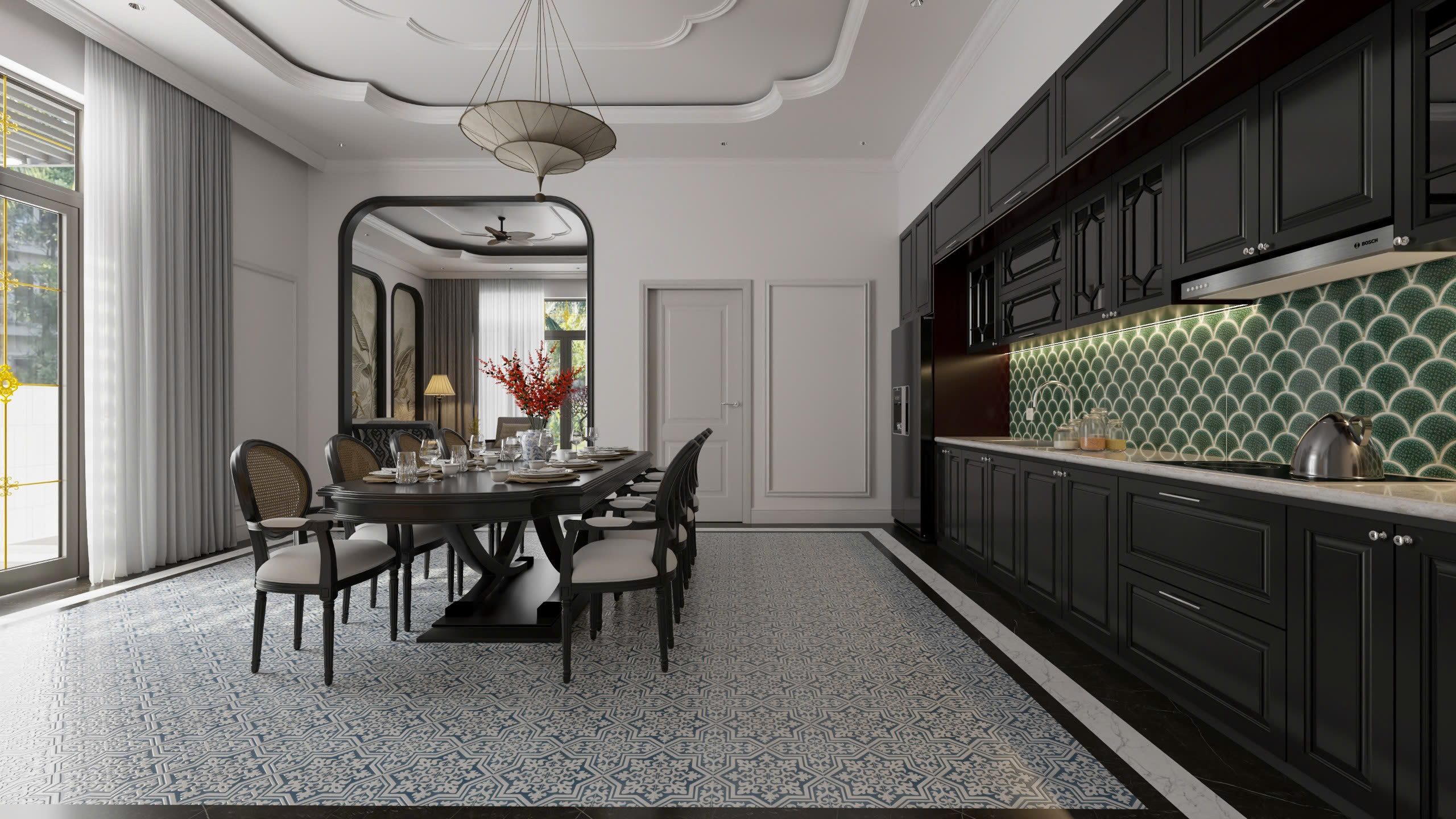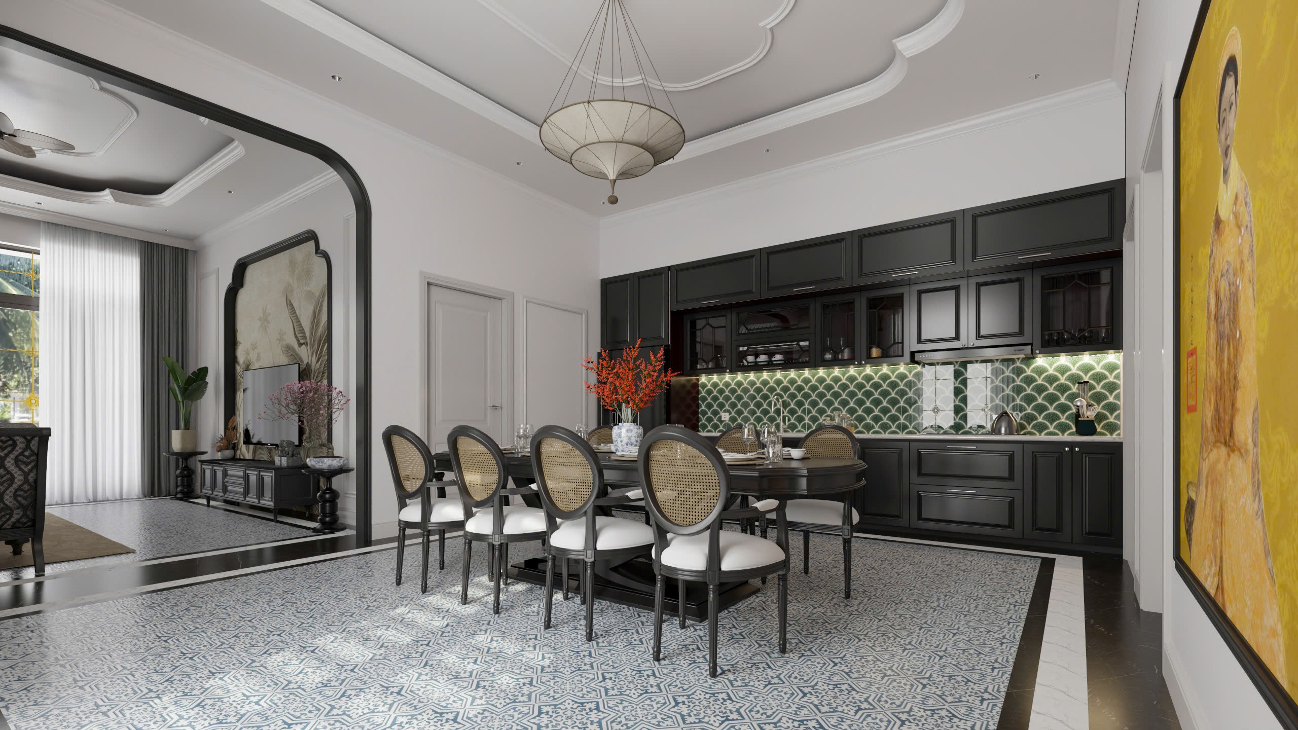 Bước qua khung vòm sơn đen mềm mại, ta như được dẫn vào một không gian khác – ấm cúng, gần gũi nhưng đầy tinh tế. Đây là khu vực bếp và bàn ăn, nơi hơi thở truyền thống được kết hợp hài hòa với phong cách hiện đại, mang lại cảm giác vừa thân thuộc, vừa sang trọng.